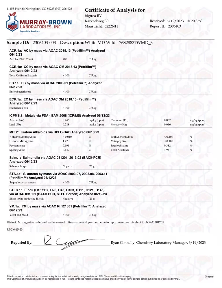 Labor-Zertifikate sind bei uns, genauso wie bei allen anderen Händlern, natürlich immer nur Stichproben. Deshalb möchten wir darauf hinweisen, dass es innerhalb einer Charge Abweichungen im Alkaloidgehalt geben kann. Trotzdem erhalten wir auf diese Weise wichtige Anhaltspunkte und können so ein sicheres Produkt gewährleisten.