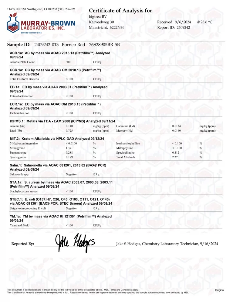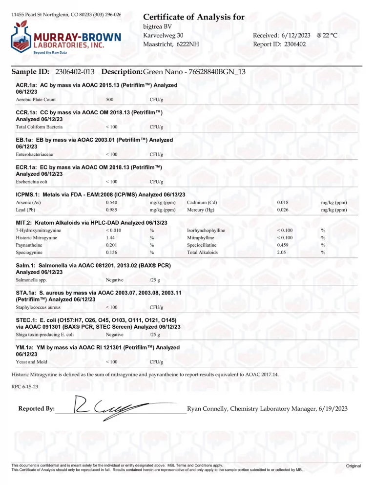 Die Labor-Zertifikate für unser Premium Kratom sind hier, oder über den QR-Code auf der Rückseite jeder Verpackung einsehbar.